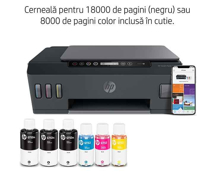 | Continut pachet | HP Smart Tank 515; 3 x flacon GT53XL de cerneala originala HP de 135 ml, negru; sticla de cerneala cyan original HP GT52; sticla de cerneala magenta originala HP GT52; sticla de cerneala galbena originala HP GT52; Ghid configurare; Cablu de alimentare |