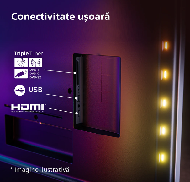 Conectori | 3 x HDMI 2.0, 2 x USB, RJ-45, CI+ slot, Conector satelit, Coaxial (Antena TV), Conector Service |