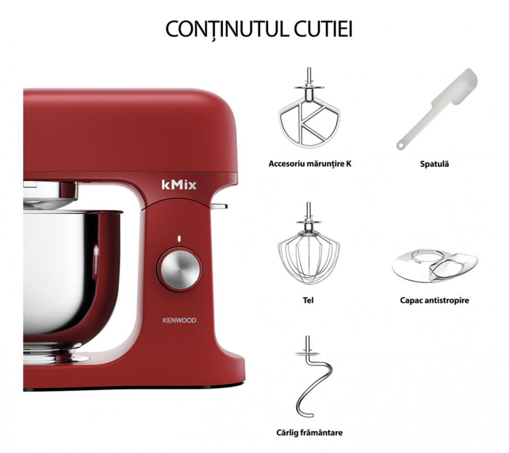 | Continut pachet | Accesoriu K pentru maruntirea ingredientelor; Carlig pentru framantarea aluatului; Tel pentru amestecarea cremelor; Bol; Capac antistropire; Spatula |